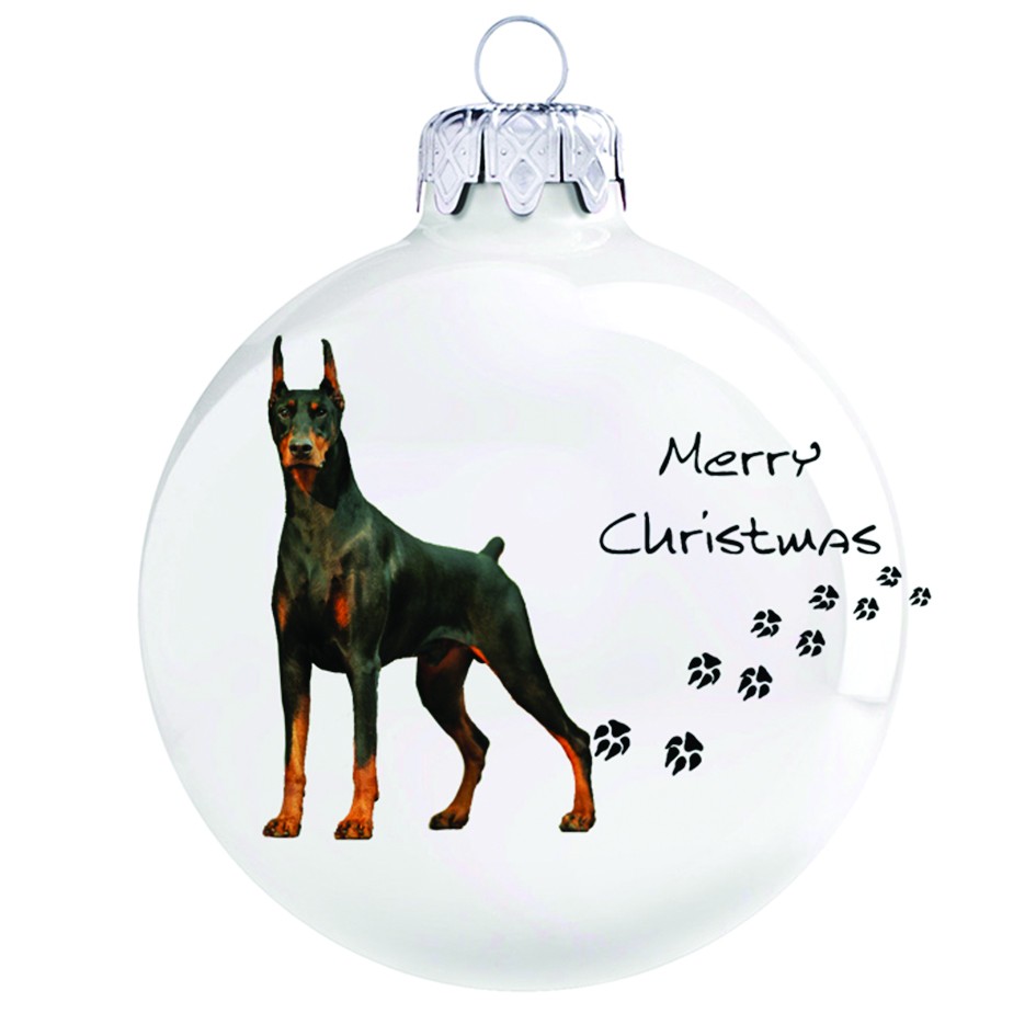 Porcelán hatású üveg fehér dísz "Dobberman" mintával. Üveg karácsonyfadíszeinket nagy gondossággal, kézzel készítjük, így biztosítva a magas minőséget és az egyedülálló mintázatot.