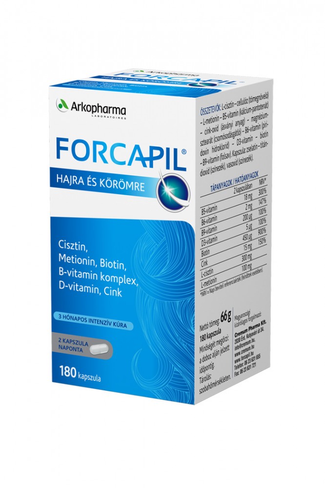 180 darabos Forcapil egy étrend-kiegészítő készítmény azok számára, akik szeretnék megőrizni hajuk és körmeik szépségét. Ajánlott hajtömeg vagy hajerősség vesztéskor. Javuló hajerősség, vitalitás feltűnő ragyogás a hajnak. Az étrend-kiegészítő nem helyettesíti a változatos étrendet és az egészséges életmódot. Terhes és szoptató anyukák ne használják. Amennyiben Ön cukorbeteg, konzultáljon a készítményről kezelőorvosával. Gyermekektől gondosan elzárva tartandó.