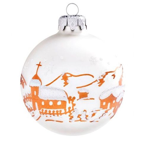 Matt fehér dísz havas falu mintával, 10 cm. Üveg karácsonyfadíszeinket nagy gondossággal, kézzel készítjük, így biztosítva a magas minőséget és az egyedülálló mintázatot.