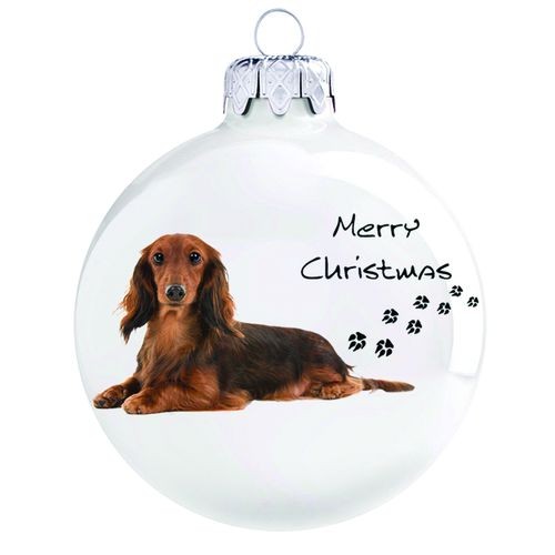 Porcelán fehér dísz "Hosszú szőrű tacskó" mintával, 8 cm. Üveg karácsonyfadíszeinket nagy gondossággal, kézzel készítjük, így biztosítva a magas minőséget és az egyedülálló mintázatot.