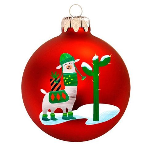 Matt piros gömb egy vidám láma mintával. 8 cm-es üvegből készült belül valódi ezüsttel kezelt karácsonyfadísz.