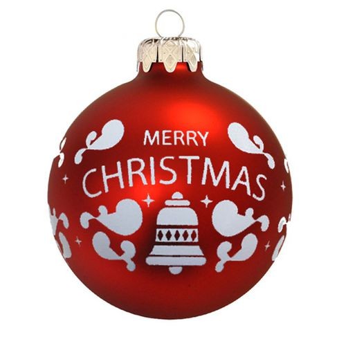 Matt piros dísz "Merry Christmas" felirattal és sormintával, 6 cm. Üveg karácsonyfadíszeinket nagy gondossággal, kézzel készítjük, így biztosítva a magas minőséget és az egyedülálló mintázatot.
