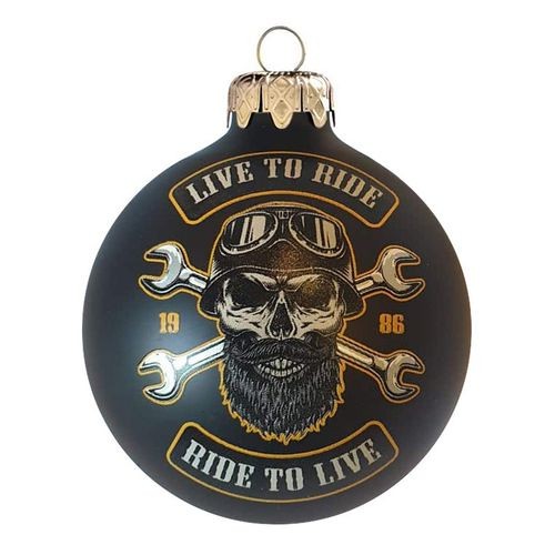 Matt fekete dísz menő "motoros" mintával, 8 cm. Üveg karácsonyfadíszeinket nagy gondossággal, kézzel készítjük, így biztosítva a magas minőséget és az egyedülálló mintázatot.