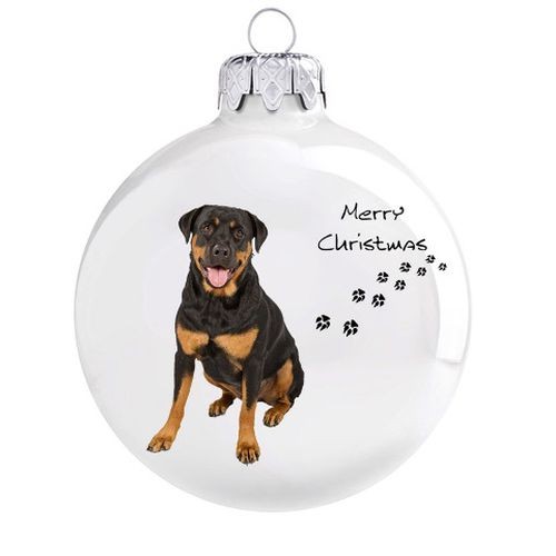Porcelán fehér dísz "Rottweiler" mintával, 8 cm. Üveg karácsonyfadíszeinket nagy gondossággal, kézzel készítjük, így biztosítva a magas minőséget és az egyedülálló mintázatot.