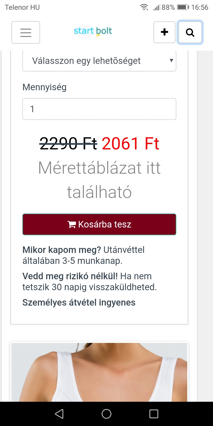 A termék adatlapon található méret és egyéb jellemzők kiválasztása után kell használni a Kosárba tesz nyomógombot a vásárláshoz. Több terméket hozzá lehet adni a kosárhoz és a Pénztári ablak segítségével lehetséges a megrendelés leadása.