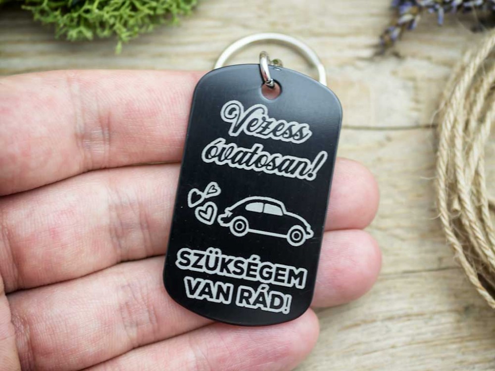 "Vezess óvatosan! Szükségem van rád!" feliratos fekete színű alumínium téglalap medálos kulcstartó Számotokra állítottunk össze egy kedves meglepetést!   Akinek jogosítványa van, szinte minden nap használja az autóját, vagy a szolgálati járművét. A hivatásos sofőrök pedig különösen sok időt töltenek az utakon. Vigyázzunk egymásra és magunkra is! Sose feledjük, a partnerség a legfontosabb, mindenkit hazavárnak! Lepj meg egy számodra fontos embert ezzel a szívhez szóló kulcstartóval. Ezt a nagyszerű ajándék ötletünket egy gravírozott medál, és egy kulcstartó alkotja. A kulcstartót egy téglalap alakú 50×29 mm méretű elegáns pink színű medál díszíti, amit lézer gravírozunk. A gravírozott felirat színe fehér.