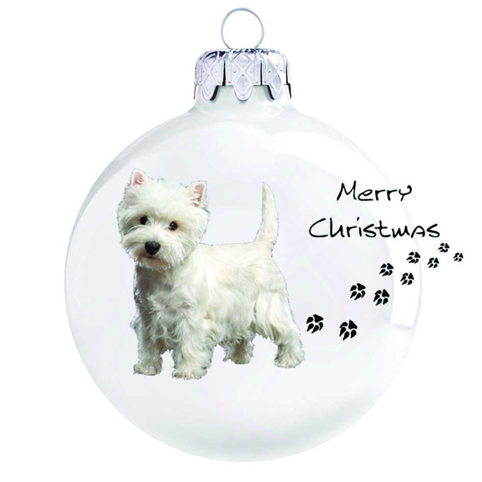Porcelán hatású fehér üveg dísz "Westie" mintával. Üveg karácsonyfadíszeinket nagy gondossággal, kézzel készítjük, így biztosítva a magas minőséget és az egyedülálló mintázatot.